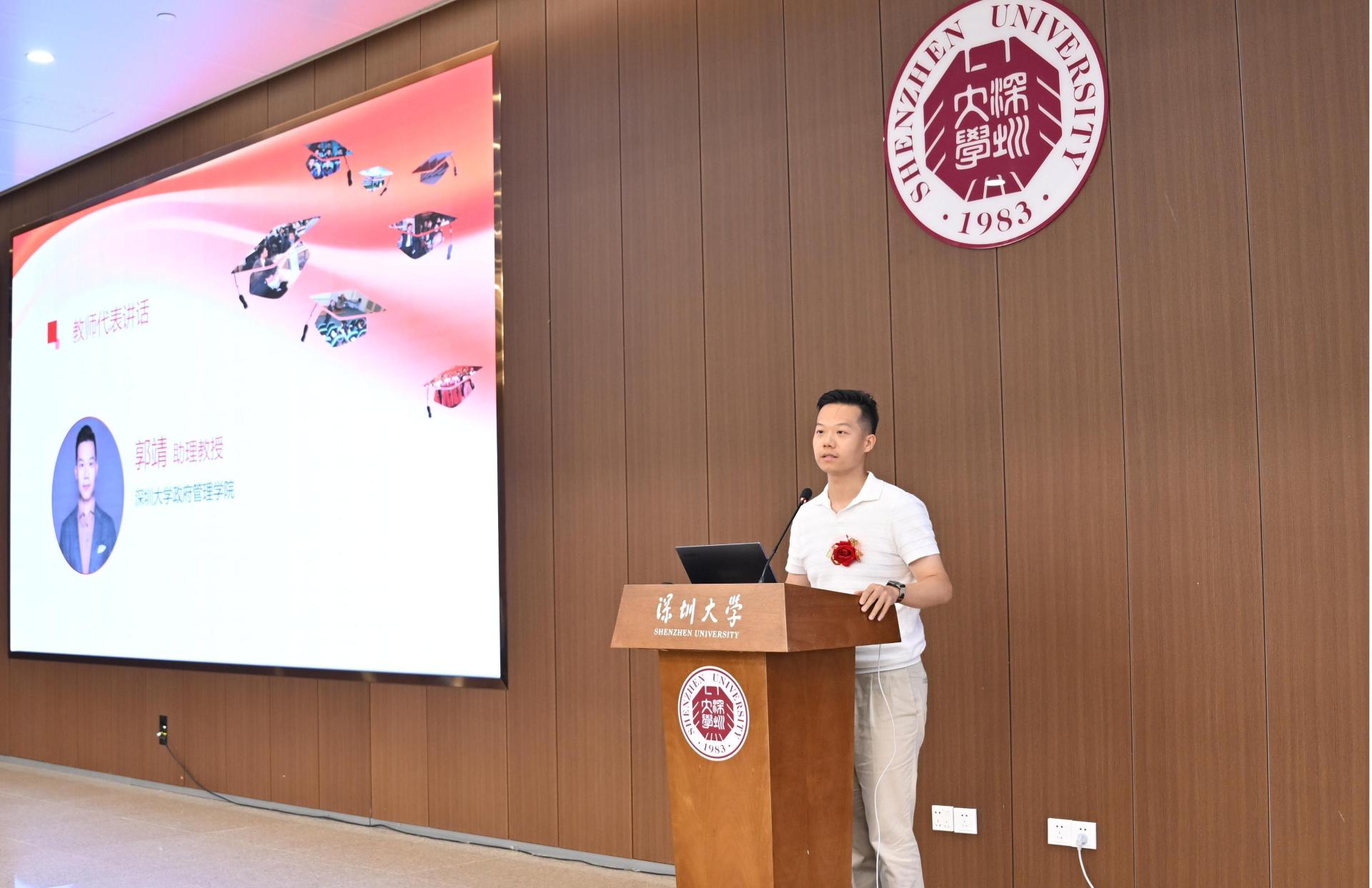 郭靖助理教授作为教师代表发言。郭老师首先祝贺各位新同学加入政府管理学院,并结合自己学习和工作的经历与大家分享自己的心得体会。他强调在论文写作过程中,将锻炼与提升同学们的问题意识、逻辑思维与写作能力,希望同学们能够克服拖延症,顺利完成学业。