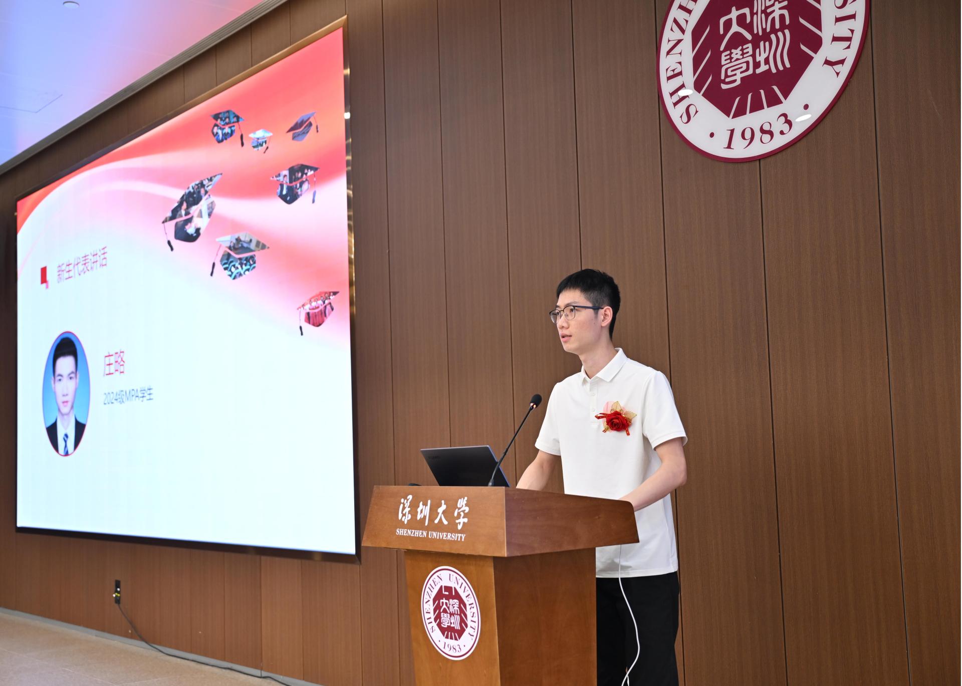 2024级MPA学生庄略作为新生代表发言。作为深圳大学的本科毕业生,三年后重新以MPA新生的身份回到丽湖新校区,他希望与同学们一起秉承“敢闯敢试、敢为人先、埋头苦干”的特区精神,践行“自立、自律、自强”的深大品格,把握好当下每分每秒,认真走好每一步路,不负韶华,砥砺前行,在追求卓越的道路上并肩成长、乘风破浪。