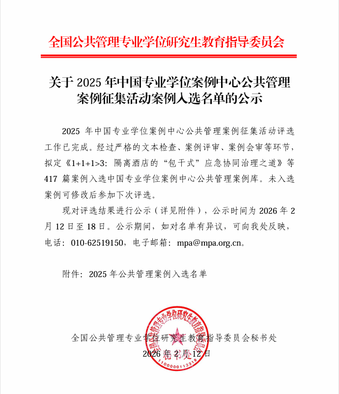 近日,全国公共管理专业学位研究生教育指导委员会公布了2025年中国专业学位案例中心公共管理案例征集活动入选名单。我校MPA教育中心报送的4篇优秀案例成功入选,这一成绩不仅刷新了我校在该项评选活动的最佳纪录,更是对我校MPA教育中心案例实践教学体系建设的充分认可。