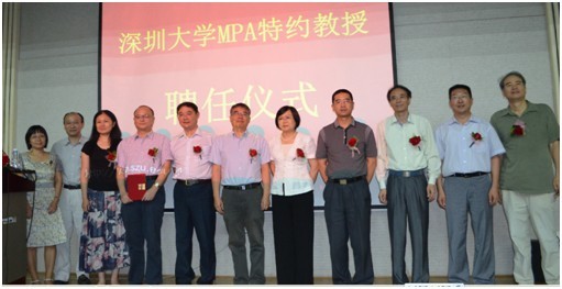典礼最后,管理学院陈智民院长向深圳大学MPA特约教授正式颁发聘书,本次受聘的特约教授有深圳市民间组织管理局局长马宏,深圳市南山区委常委、组织部长王卫,深圳市坪山新区地方税务局局长李伟,深圳市人民政府应急管理办公室副主任杨峰,深圳市民政局副局长杨春生。