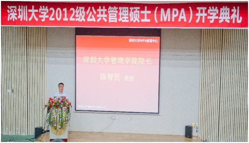 2012年9月8日上午,深圳大学2012级公共管理硕士(MPA)开学典礼在科技楼三号报告厅隆重举行。深圳大学陶一桃副书记,研究生院党委杜龙书记,特约教授深圳市民间组织管理局马宏局长、深圳市南山区委常委组织部部长王卫、深圳市坪山新区地方税务局李伟局长、深圳市人民政府应急管理办公室杨峰副主任、深圳市民政局杨春生副局长,管理学院陈智民院长、刘军副院长、李丽副院长应邀出席,MPA教师代表,MPA教育中心全体工作人员,2012级50位新生一同参加了本次开学典礼。典礼由管理学院党委书记、MPA教育中心主任宋涛教授主持。