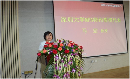 特约教授代表马宏局长作了精彩的聘任发言,她表示受聘深圳大学MPA特约教授十分荣幸,希望充分发掘特约教授们的实践经验,结合深圳大学MPA教师和学生的理论基础,教学相长、融合创新,以深圳大学MPA全体师生的能力和智慧为深圳的转型发展贡献力量。