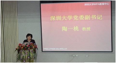 深圳大学党委副书记陶一桃教授代表学校向2012级学员的到来表示欢迎。陶一桃副书记首先介绍了深圳大学的发展现状以及未来的发展思路,对MPA聘请具有实践经验的学者型官员为特约教授的探索表示肯定和支持,希望MPA能继续秉承开放性的教学特色,引进优秀师资,创新教学模式,将深圳大学MPA办出特色,办成精品。最后陶一桃副书记祝愿2012级MPA学员能在深圳大学的发展和辉煌中收获自己的人生。
