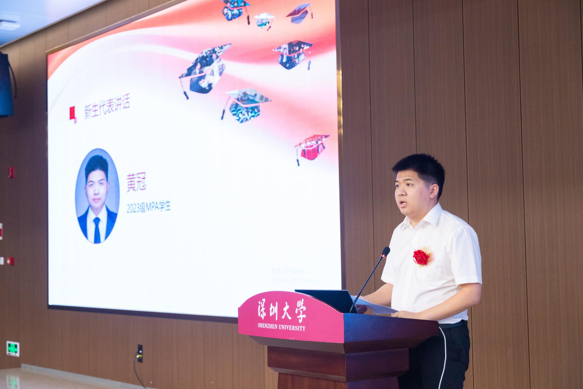 2023级MPA学生黄冠作为新生代表发言。他感谢深圳大学给予新生们深造的机会。作为在职研究生,经历了工作的磨砺和社会的考验,更加清楚学习的重要意义,希望同学们都能尽快地融入到深圳大学浓厚的学习氛围中,秉承“自立、自律、自强”的深大校训,以最饱满的热情,最全面的投入,最实际的行动来完成这来之不易的三年学习机会,虚心修业,学有所成。