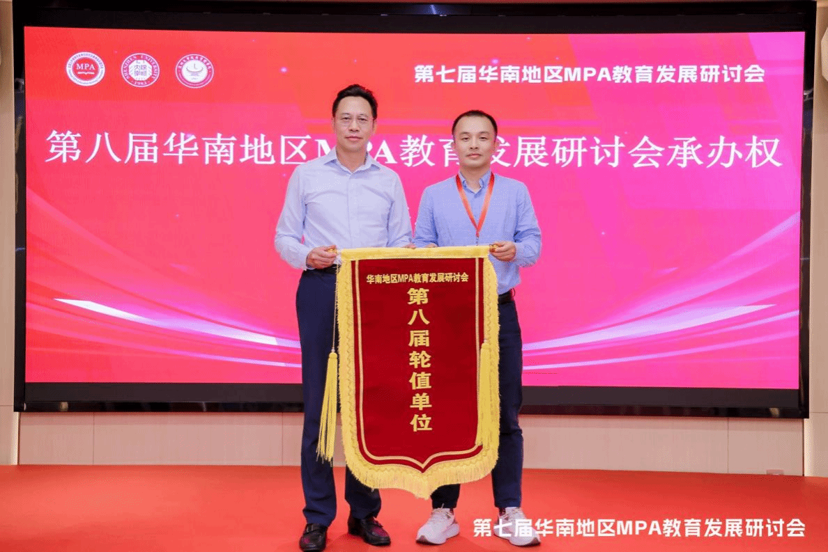 在最后环节,进行了华南地区MPA教育发展研讨会承办权的交接仪式,第七届研讨会组委会代表何燕辉书记将荣誉与责任传递给第八届研讨会组委会代表、广东外语外贸大学社会与公共管理学院副院长费久浩副教授,费久浩副院长代表广东外语外贸大学向华南地区的MPA培养单位发出诚挚的邀请,期盼明年相约羊城,共话成长、共绘蓝图。